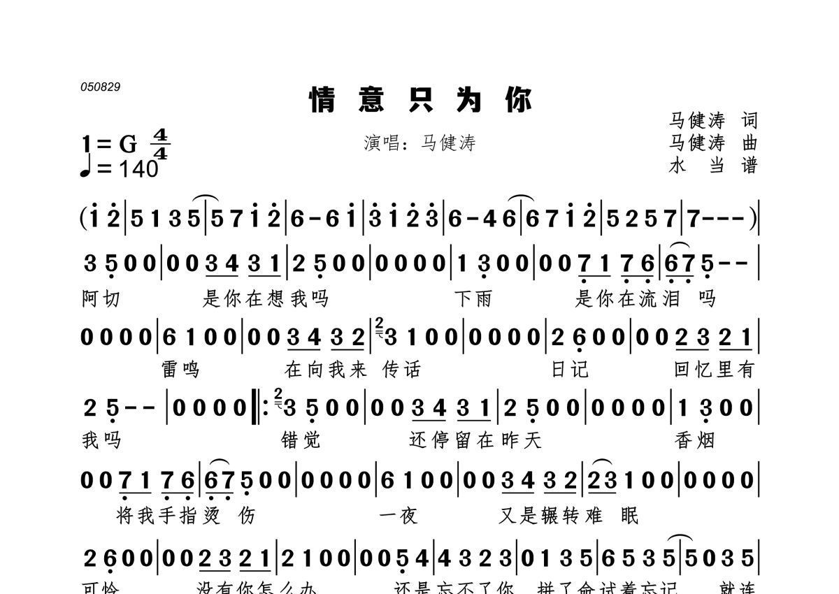 情意只为你简谱 - 马健涛演唱
