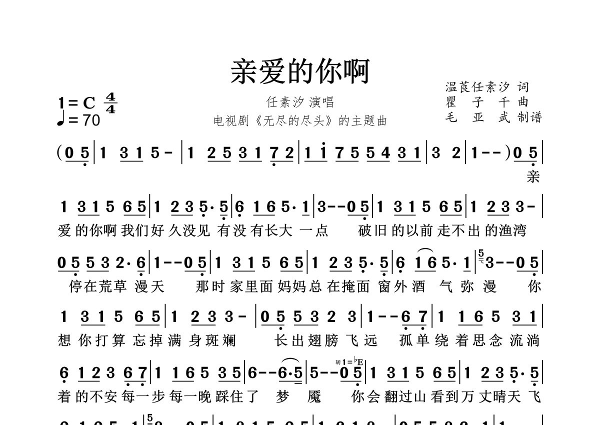 《亲爱的你啊》是任素汐演唱的一首歌曲,拍号为4/4拍,这份简谱共有一张高清图谱,图谱由 @秋天的童话 编配上传。