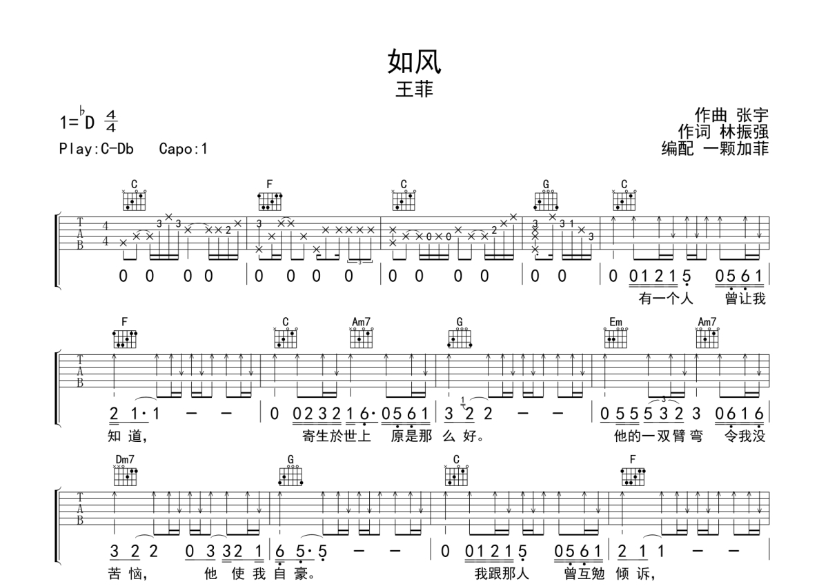 王菲《如风》吉他谱 - C调弹唱六线谱
