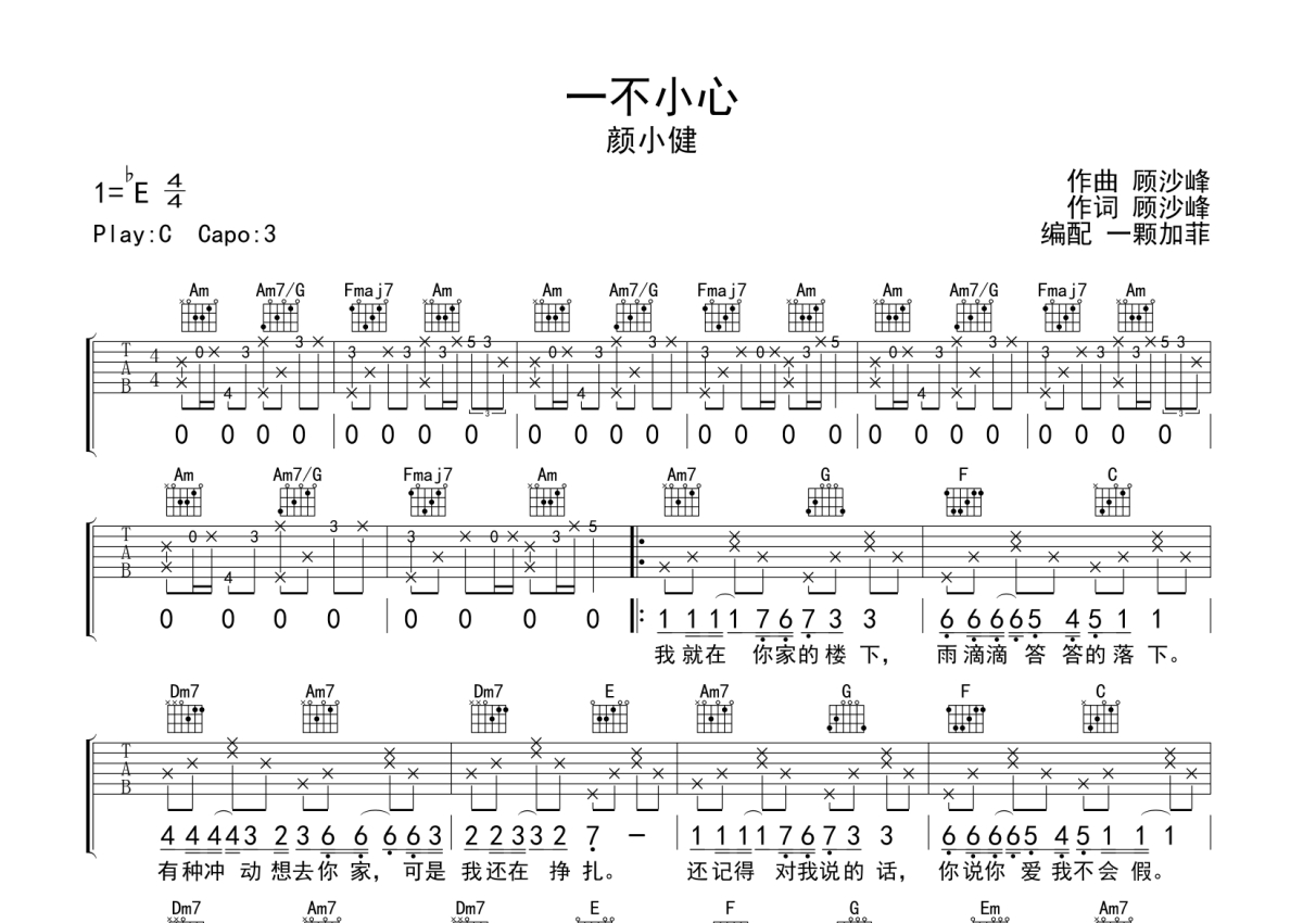 一不小心吉他谱 - 颜小健演唱 - C调弹唱六线谱
