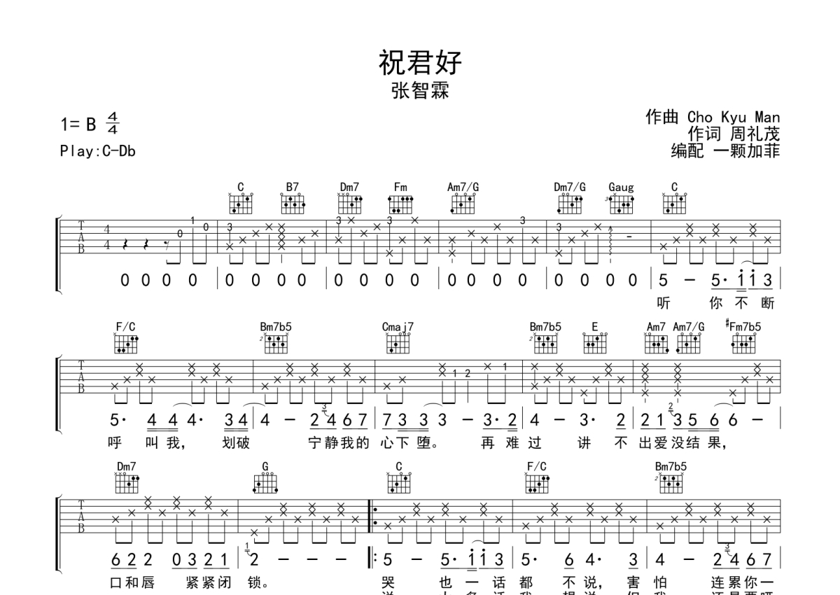 《祝君好》是张智霖演唱的一首歌曲,本吉他谱采用的是C调指法编配,这份吉他谱共有两张高清图谱,图谱由 @一颗加菲 编配上传,图谱使用六线谱编配,包含吉他和弦指法、简谱以及歌词部分,曲谱配备了相关的音频提供试听,使用这份祝君好吉他谱,可以让你更加方便地掌握这首歌曲的弹唱技巧,快来尝试吧。