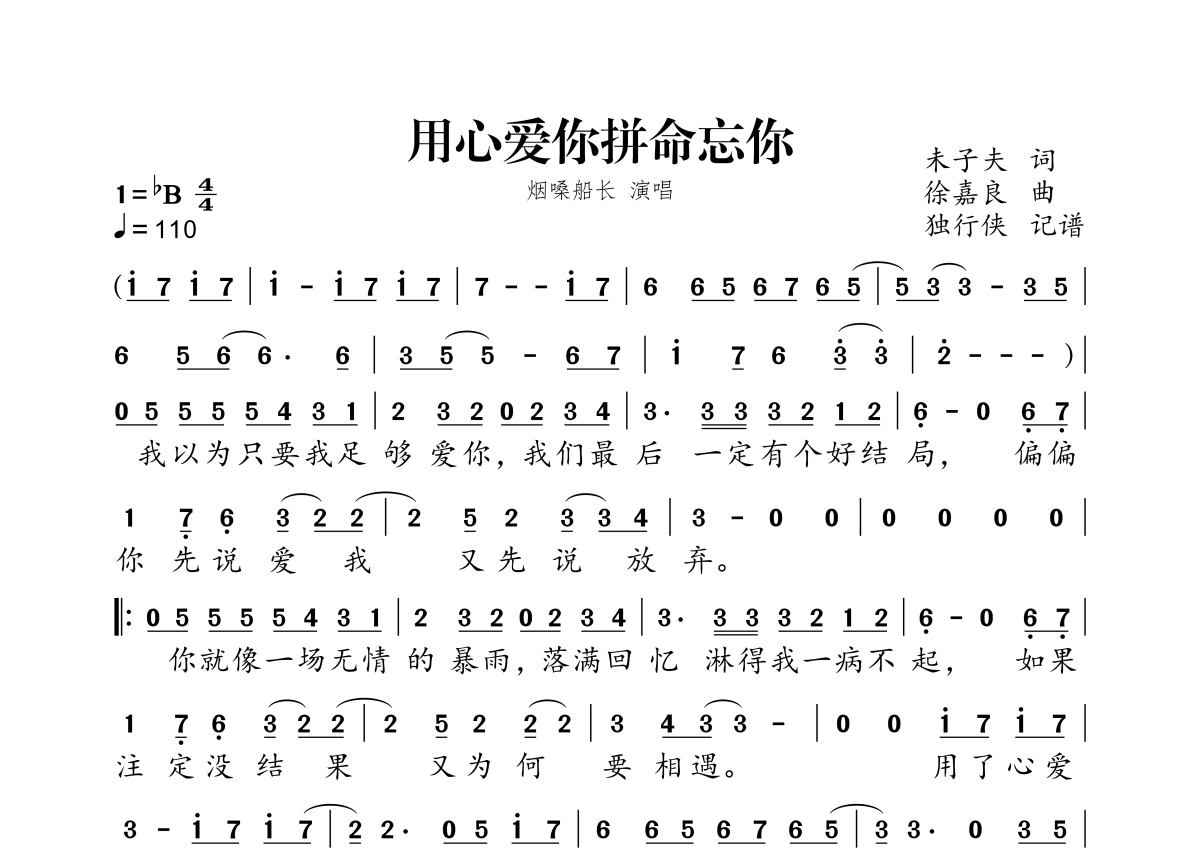 《用心爱你拼命忘你》是烟嗓船长演唱的一首歌曲,拍号为4/4拍,歌曲速度为每分钟110拍,这份简谱共有一张高清图谱,图谱由 @独行侠 编配上传。