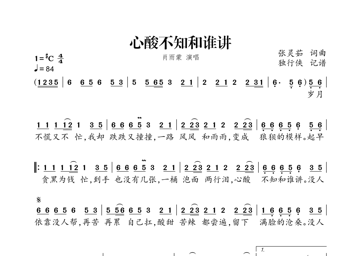 心酸不知和谁讲简谱 - 肖雨蒙演唱