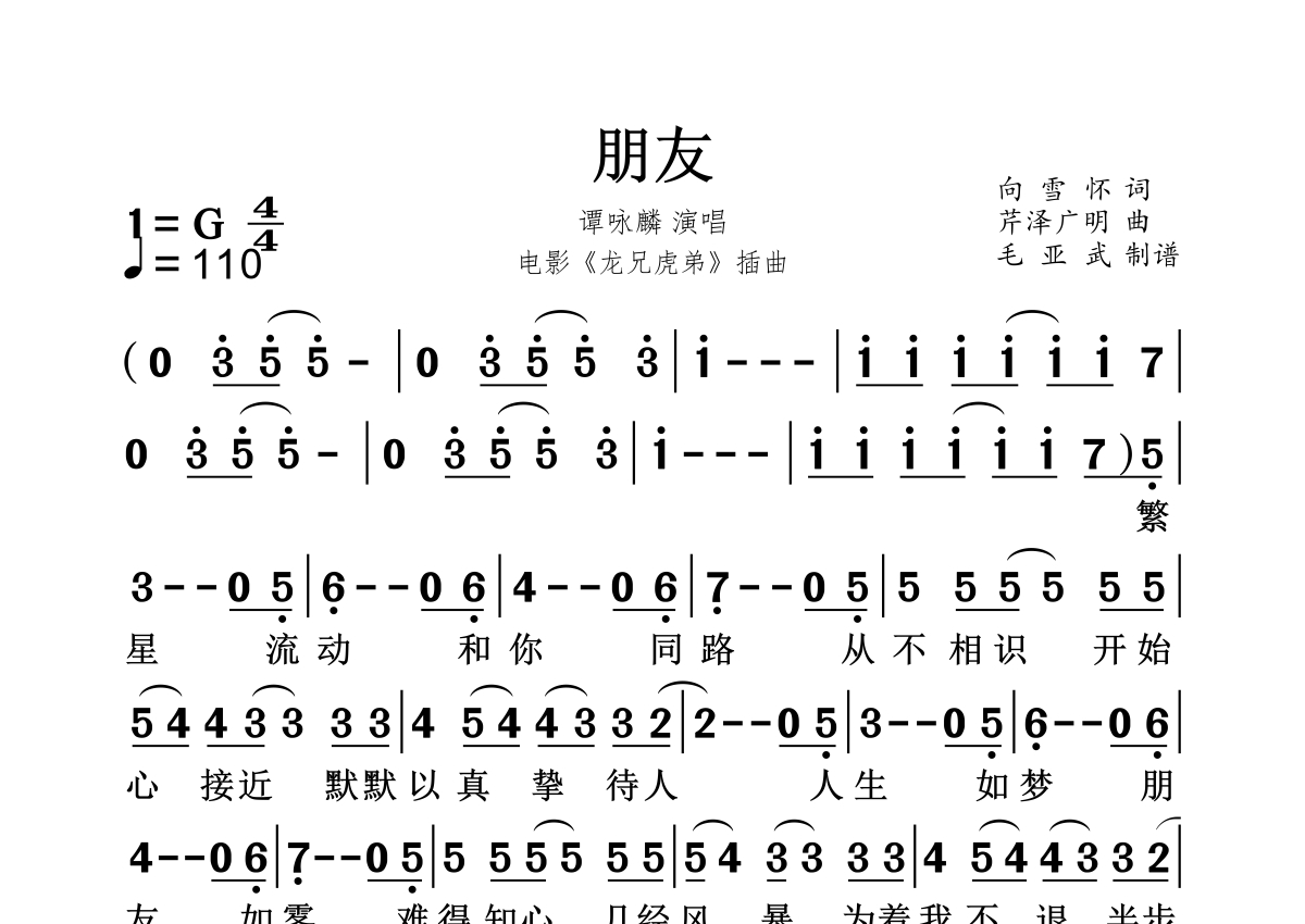 《朋友》是谭咏麟演唱的一首歌曲,拍号为4/4拍,这份简谱共有一张高清图谱,图谱由 @秋天的童话 编配上传。