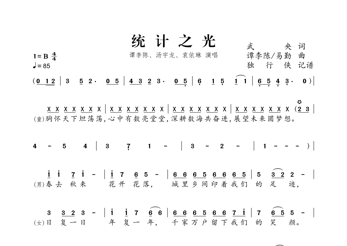 《统计之光》是谭李陈&汤宇龙&袁依琳演唱的一首歌曲,这份简谱共有两张高清图谱,图谱由 @独行侠 编配上传。