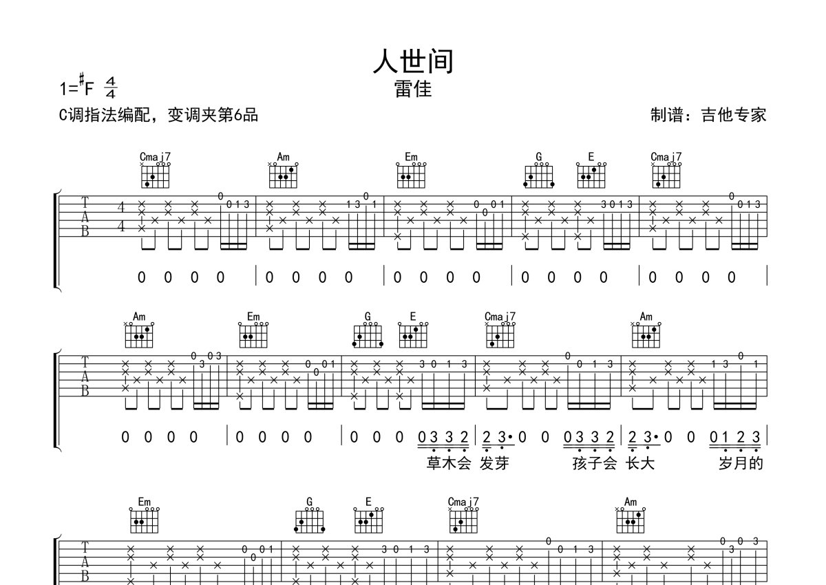 雷佳《人世间》吉他谱 - C调弹唱六线谱