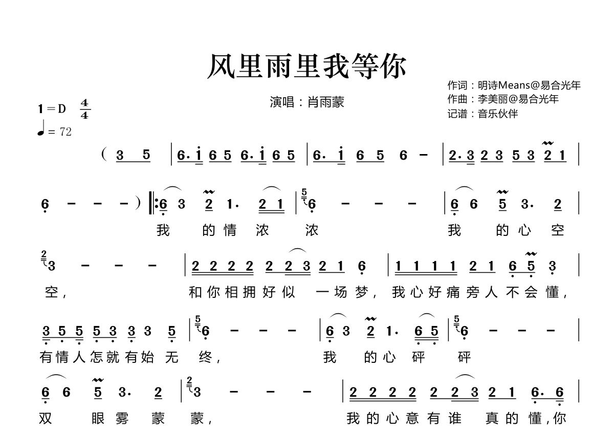 《风里雨里我等你》是肖雨蒙演唱的一首歌曲,拍号为4/4拍,歌曲速度为每分钟72拍,这份简谱共有一张高清图谱,图谱由 @音乐伙伴 编配上传。