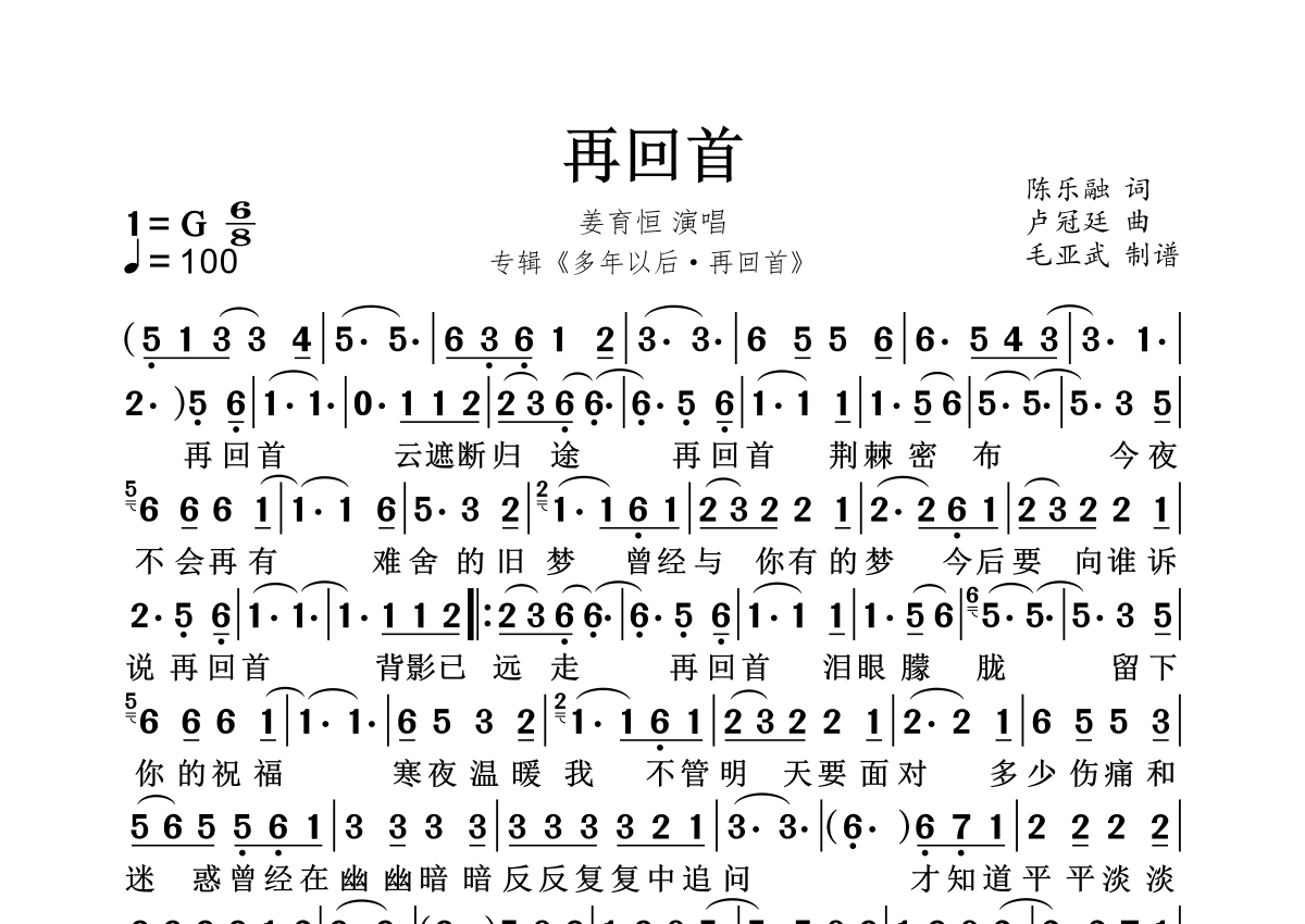 《再回首》是姜育恒演唱的一首歌曲,拍号为6/8拍,这份简谱共有一张高清图谱,图谱由 @秋天的童话 编配上传。