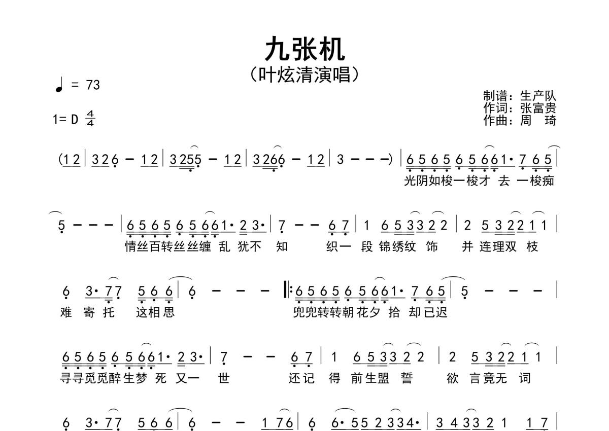 《九张机》是叶炫清演唱的一首歌曲,原版简谱,拍号为4/4拍,歌曲速度为每分钟73拍,这份简谱共有一张高清图谱,图谱由 @生产队 编配上传叶炫清演唱的歌曲《九张机》原版简谱,含前奏、间奏solo编配,精编完美版,该曲也是网络剧《双世宠妃》的主题曲,值得推荐!。