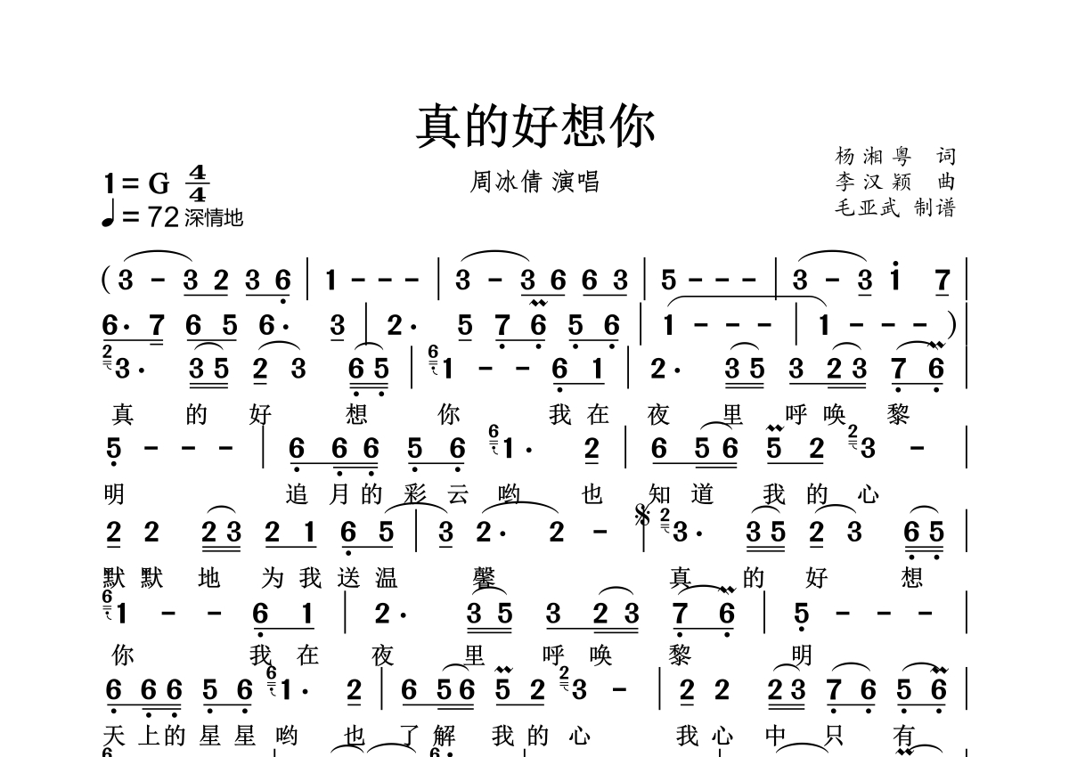 真的好想你简谱 - 周冰倩演唱