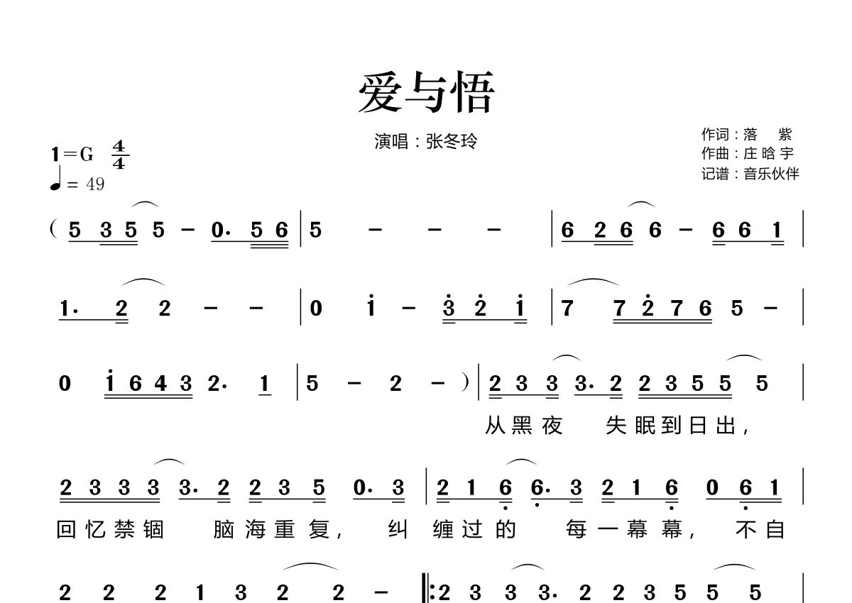 《爱与悟》是张冬玲演唱的一首歌曲,拍号为4/4拍,歌曲速度为每分钟49拍,这份简谱共有两张高清图谱,图谱由 @音乐伙伴 编配上传。