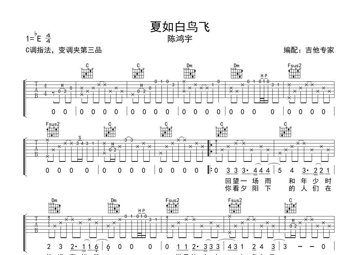 陈鸿宇《夏如白鸟飞》吉他谱 - C调弹唱六线谱