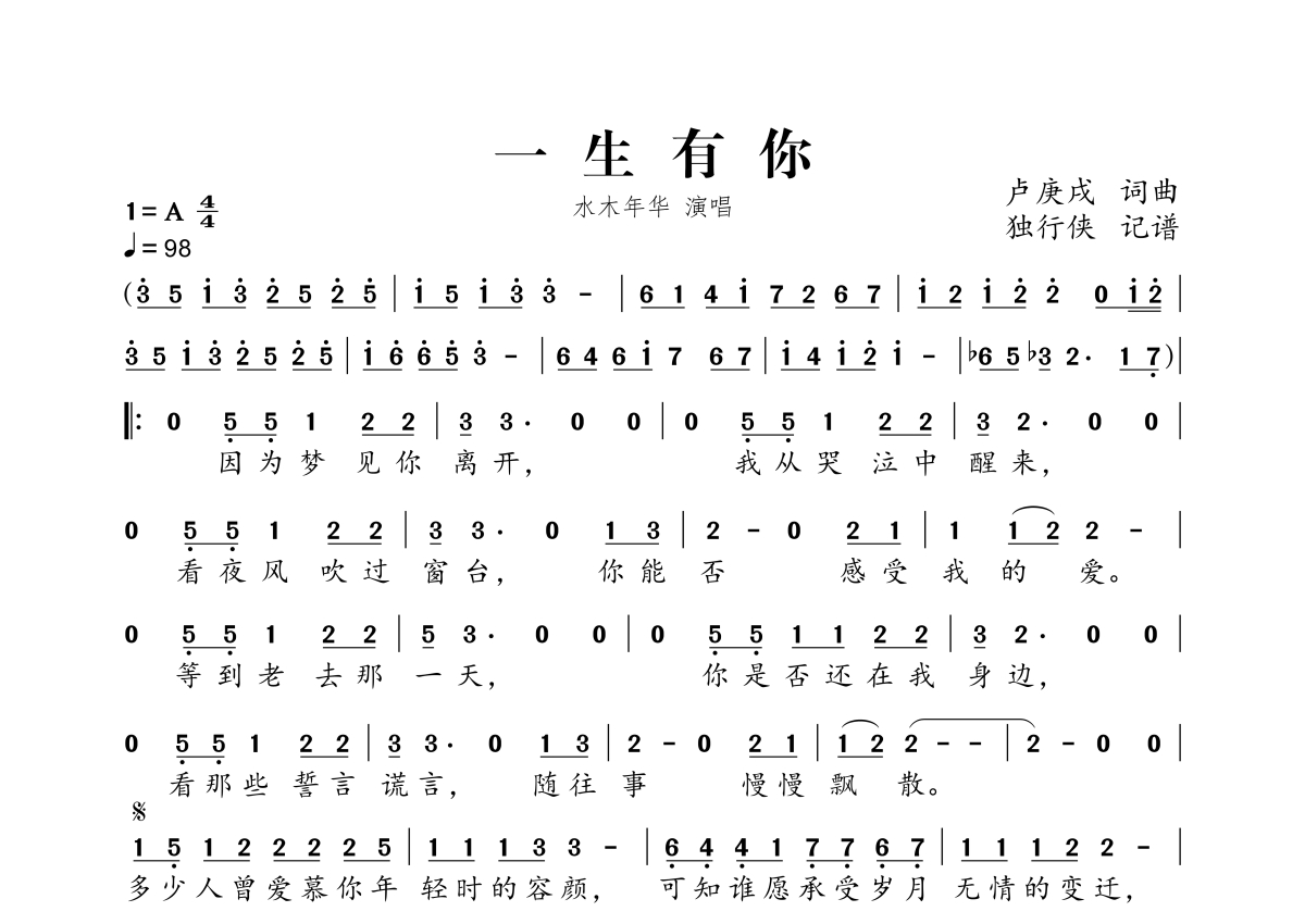 《一生有你》是水木年华演唱的一首歌曲,拍号为4/4拍,歌曲速度为每分钟98拍,这份简谱共有一张高清图谱,图谱由 @独行侠 编配上传。