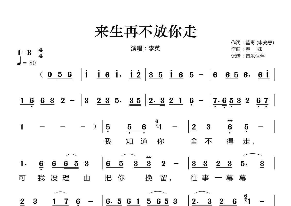 《来生再不放你走》是李英演唱的一首歌曲,拍号为4/4拍,歌曲速度为每分钟80拍,这份简谱共有两张高清图谱,图谱由 @音乐伙伴 编配上传。