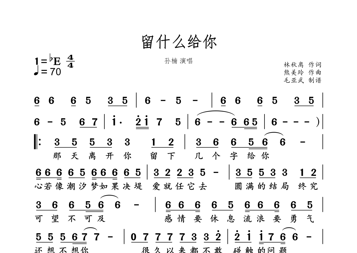 《留什么给你》是孙楠演唱的一首歌曲,这份简谱共有一张高清图谱,图谱由 @秋天的童话 编配上传。