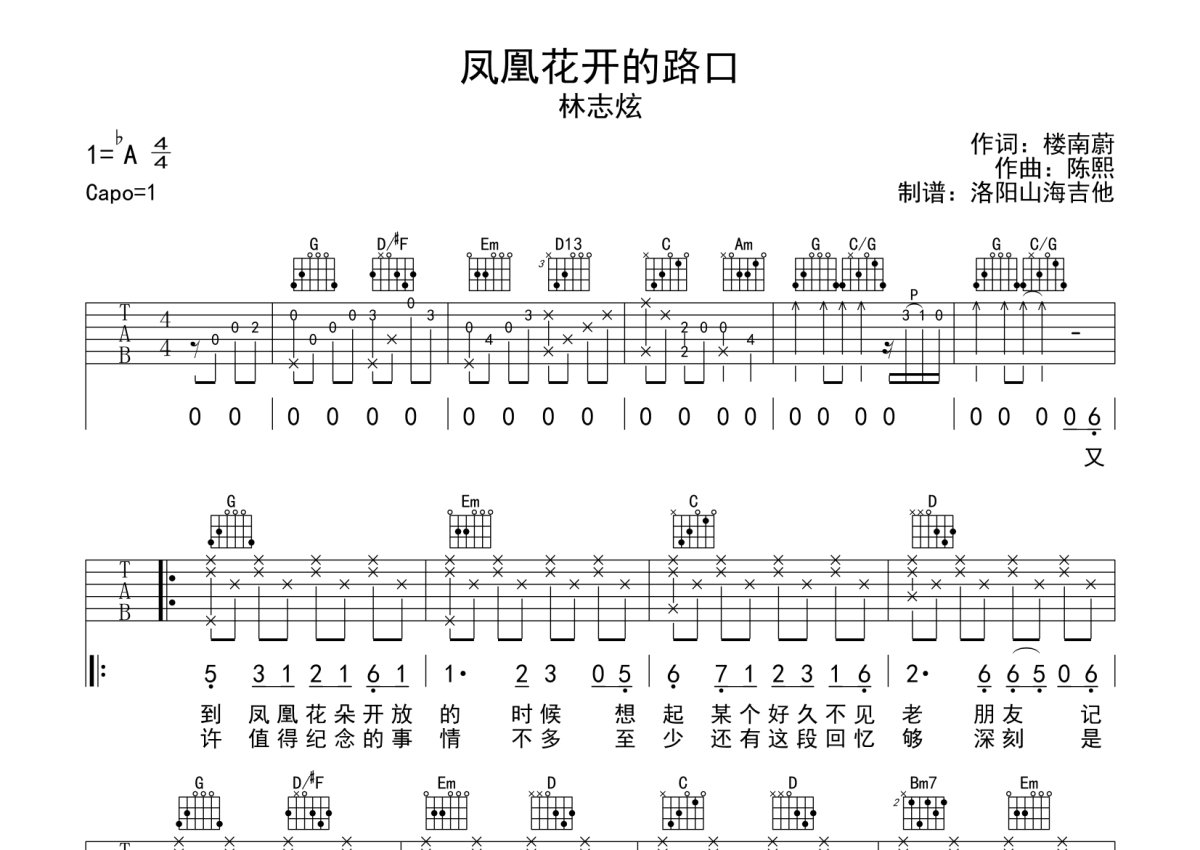林志炫《凤凰花开的路口》吉他谱 - G调弹唱六线谱