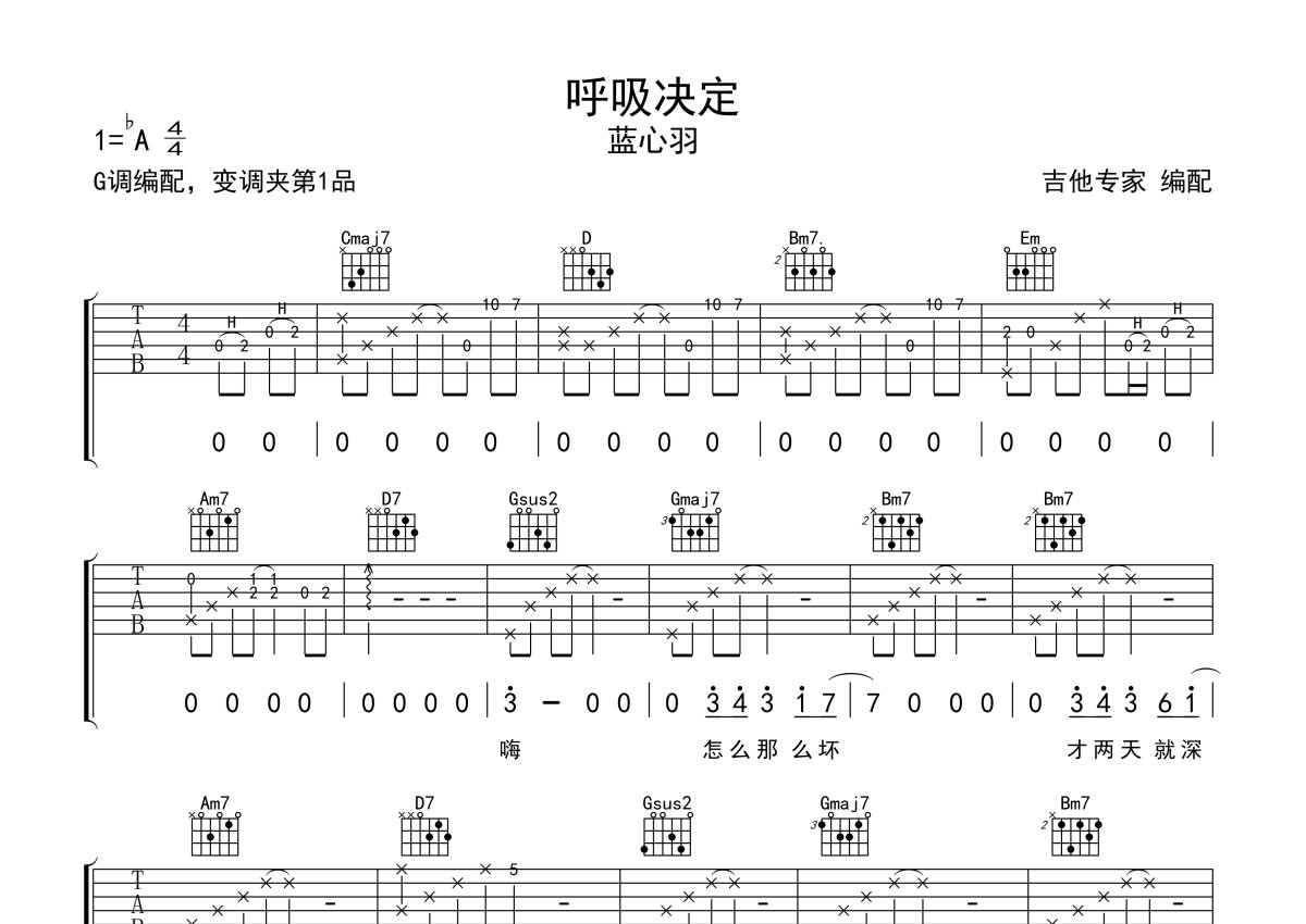 蓝心羽《呼吸决定》吉他谱 - G调弹唱六线谱