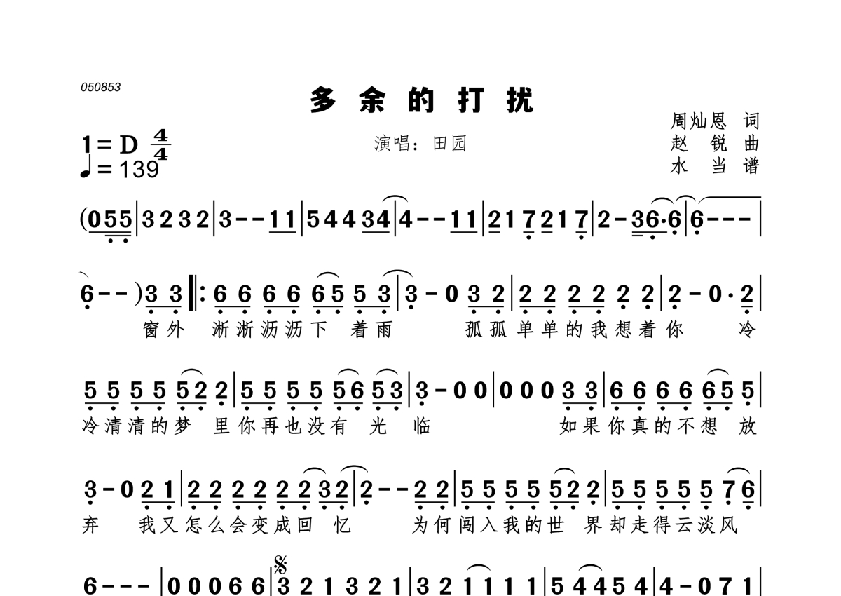 《多余的打扰》是田园演唱的一首歌曲,拍号为4/4拍,歌曲速度为每分钟139拍,这份简谱共有一张高清图谱,图谱由 @水当 编配上传。