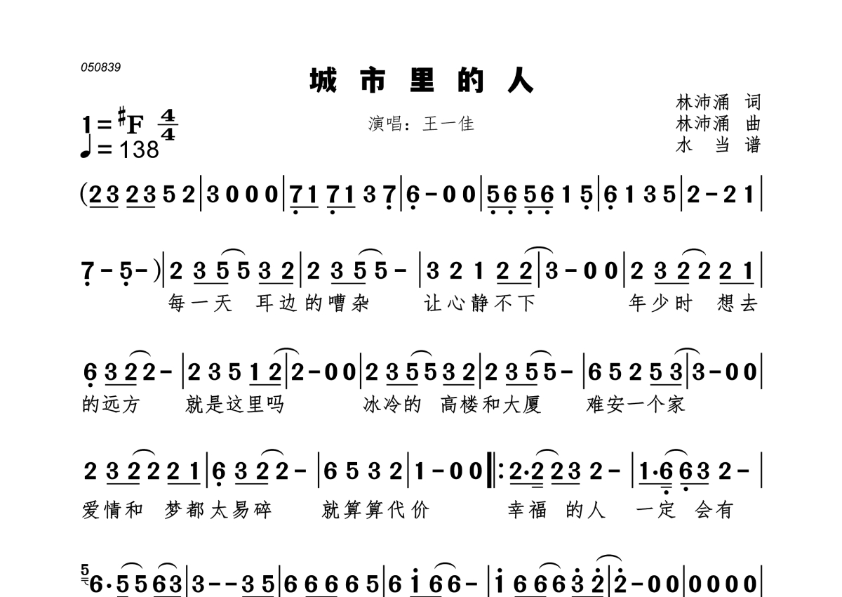 《城市里的人》是王一佳演唱的一首歌曲,拍号为4/4拍,歌曲速度为每分钟138拍,这份简谱共有一张高清图谱,图谱由 @水当 编配上传。