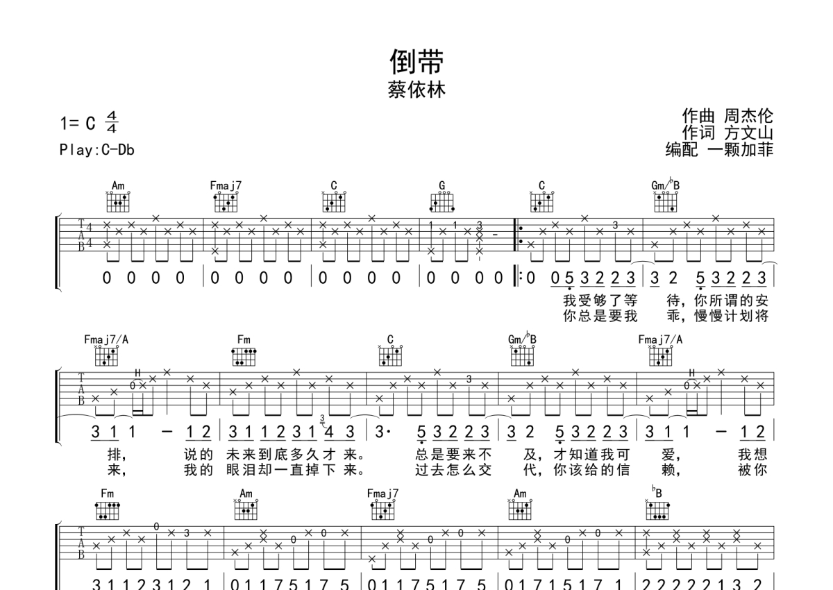 《倒带》是蔡依林演唱的一首歌曲,本吉他谱采用的是C调指法编配,这份吉他谱共有两张高清图谱,图谱由 @一颗加菲 编配上传,图谱使用六线谱编配,包含吉他和弦指法、简谱以及歌词部分,曲谱配备了相关的音频提供试听,使用这份倒带吉他谱,可以让你更加方便地掌握这首歌曲的弹唱技巧,快来尝试吧。