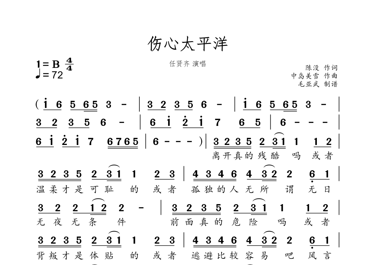伤心太平洋简谱 - 任贤齐演唱