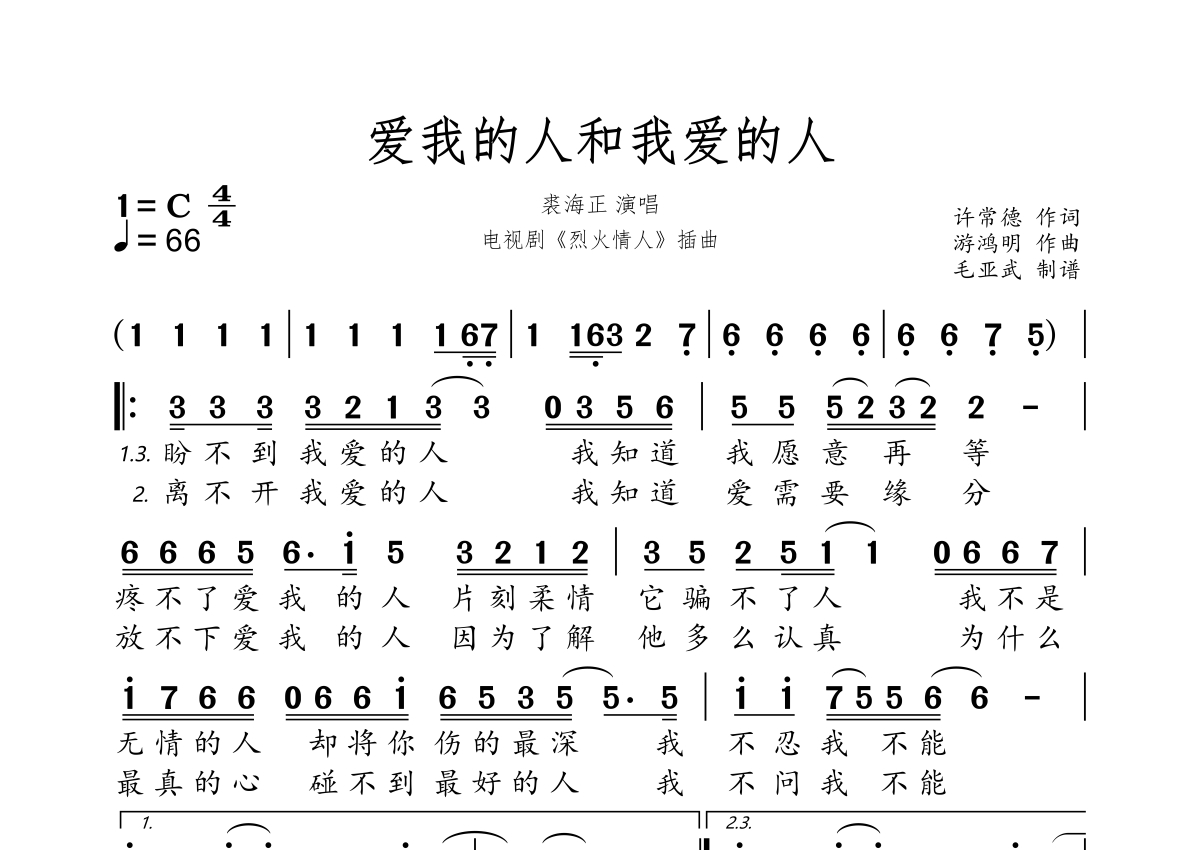 《爱我的人和我爱的人》是裘海正演唱的一首歌曲,拍号为4/4拍,这份简谱共有两张高清图谱,图谱由 @秋天的童话 编配上传。