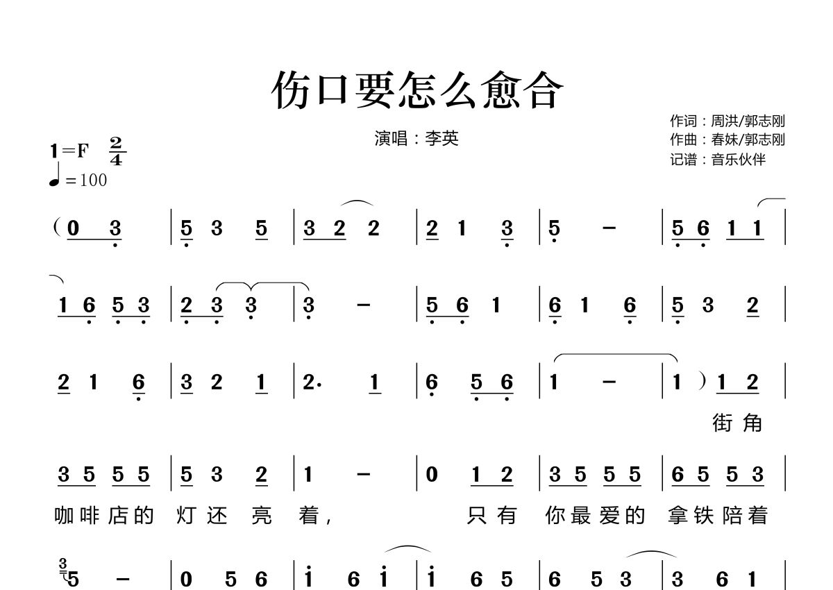 《伤口要怎么愈合》是李英演唱的一首歌曲,拍号为2/4拍,歌曲速度为每分钟100拍,这份简谱共有两张高清图谱,图谱由 @音乐伙伴 编配上传。