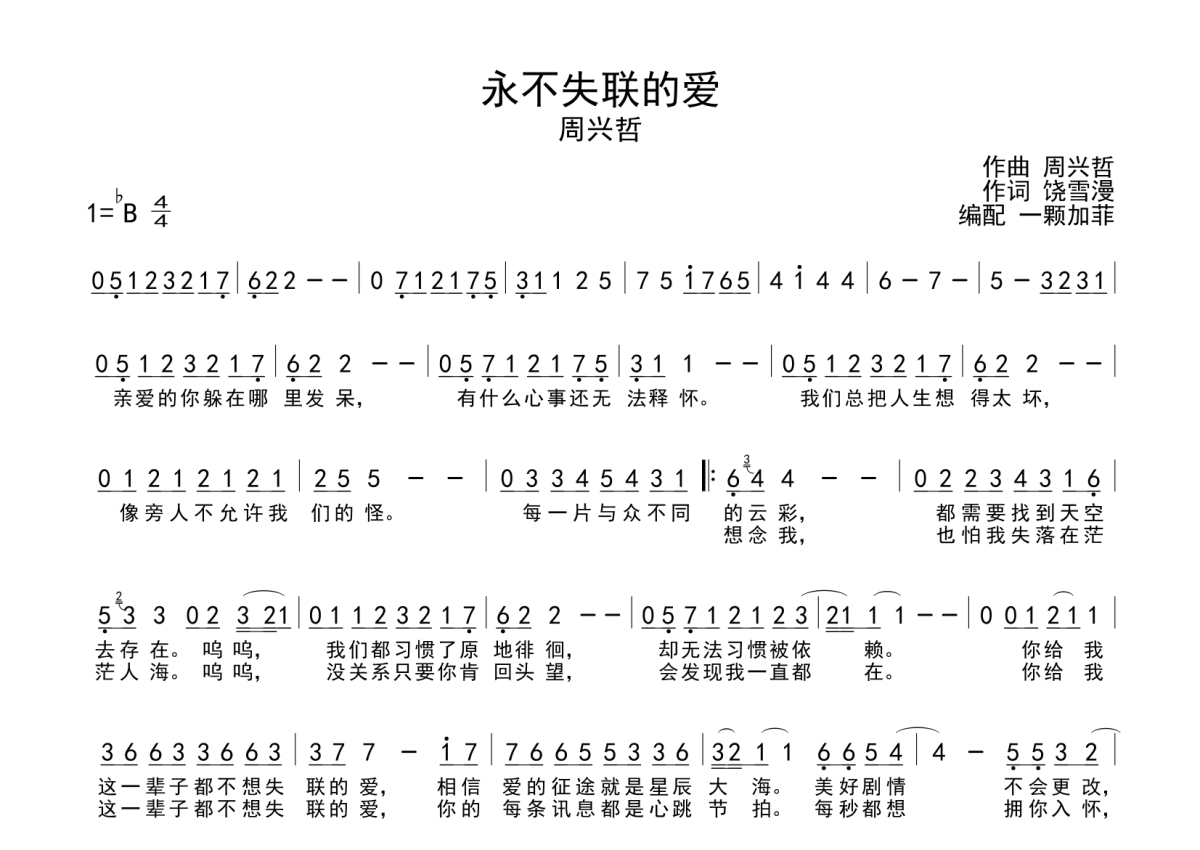 《永不失联的爱》是周兴哲演唱的一首歌曲,这份简谱共有一张高清图谱,图谱由 @一颗加菲 编配上传。