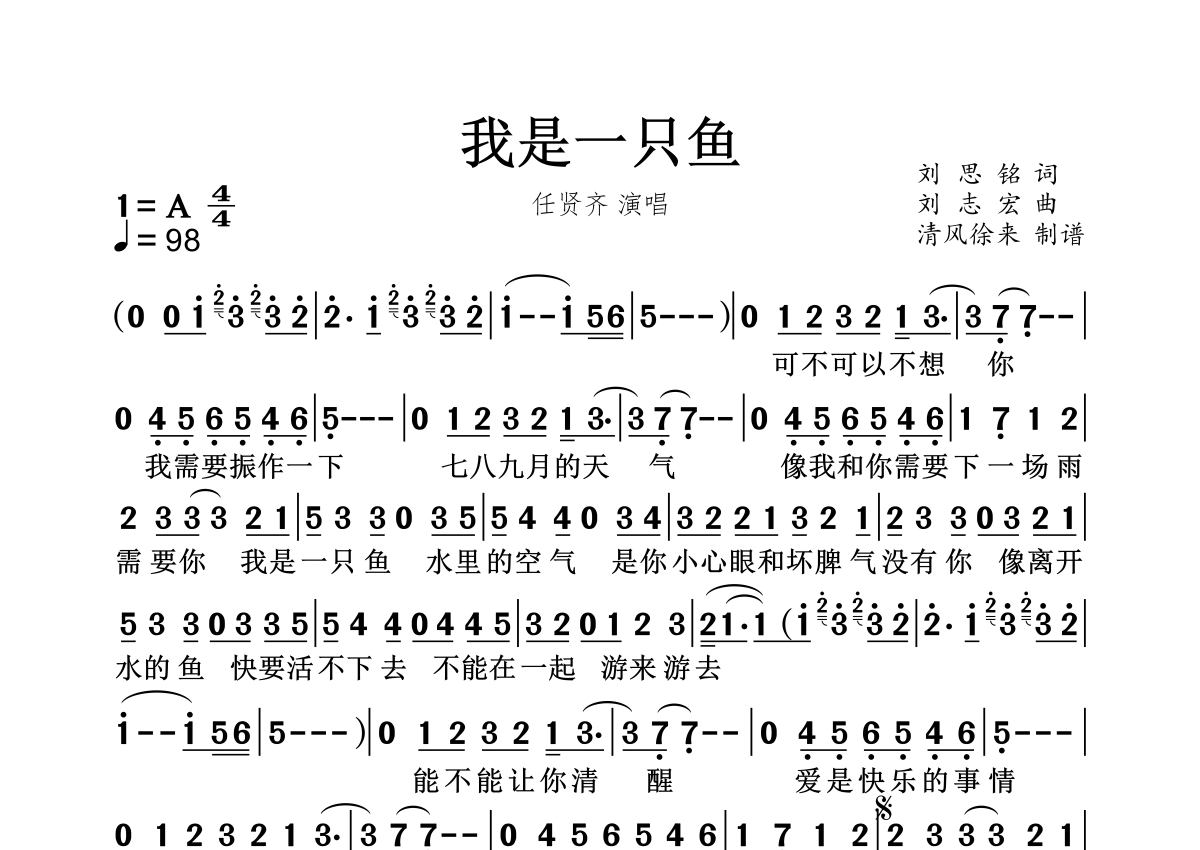 《我是一只鱼》是任贤齐演唱的一首歌曲,拍号为4/4拍,这份简谱共有一张高清图谱,图谱由 @秋天的童话 编配上传。