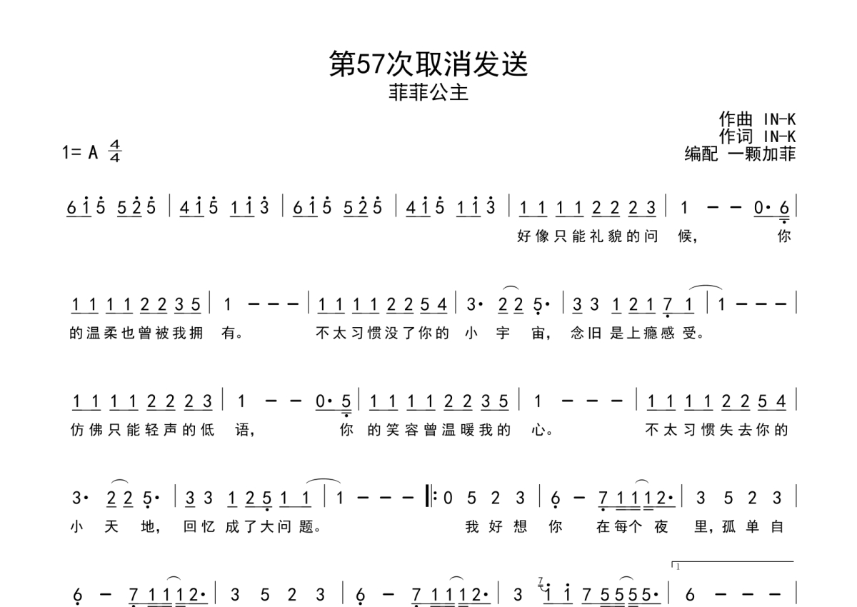 《第57次取消发送》是菲菲公主(陆绮菲)演唱的一首歌曲,这份简谱共有一张高清图谱,图谱由 @一颗加菲 编配上传。