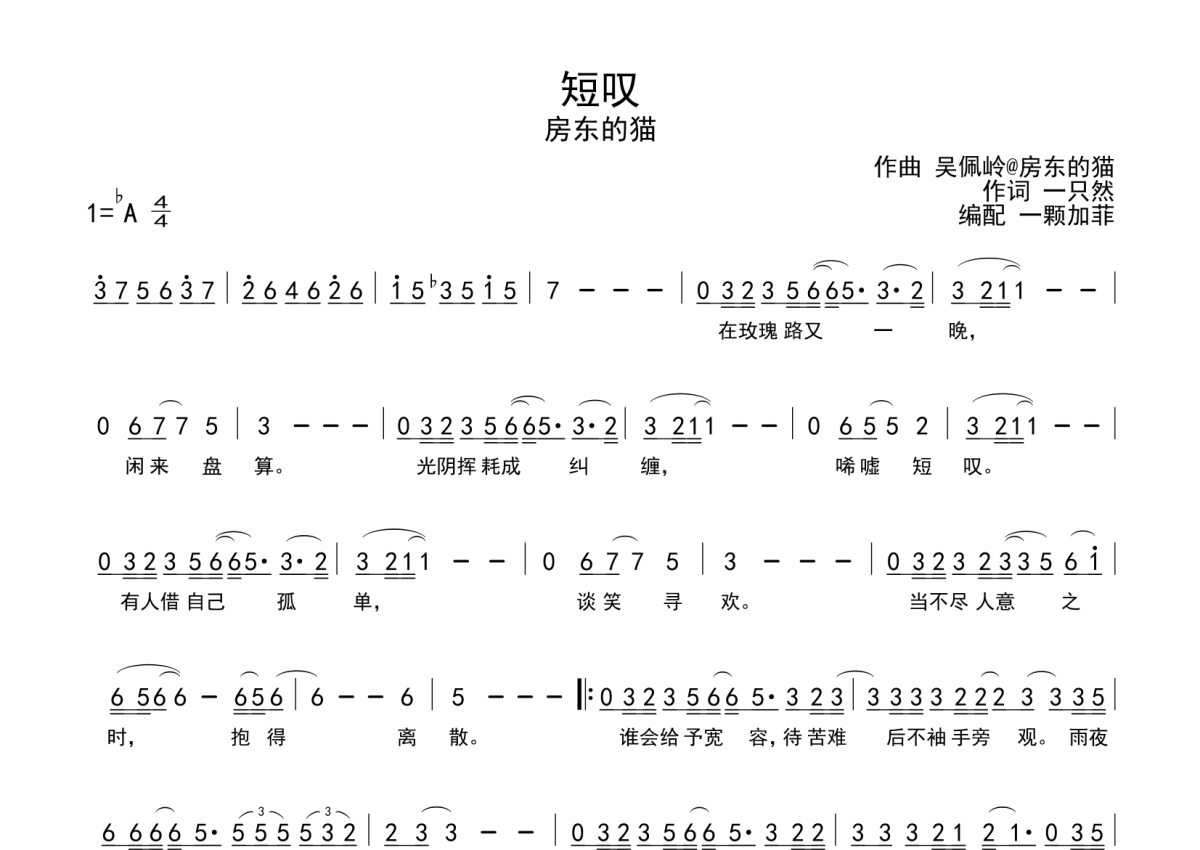 《短叹》是房东的猫演唱的一首歌曲,这份简谱共有一张高清图谱,图谱由 @一颗加菲 编配上传。