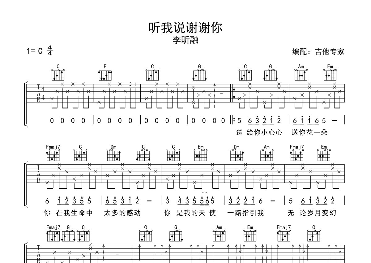 《听我说谢谢你》是李昕融演唱的一首歌曲,本吉他谱采用的是C调指法编配,这份吉他谱共有一张高清图谱,图谱由 @吉他专家 编配上传,图谱使用六线谱编配,包含吉他和弦指法、简谱以及歌词部分,使用这份听我说谢谢你吉他谱,可以让你更加方便地掌握这首歌曲的弹唱技巧,快来尝试吧。李昕融《听我说谢谢你》吉他弹唱谱,采用C调指法编配,吉他专家编配出品,共有1张高清图谱,免翻页排版设计。