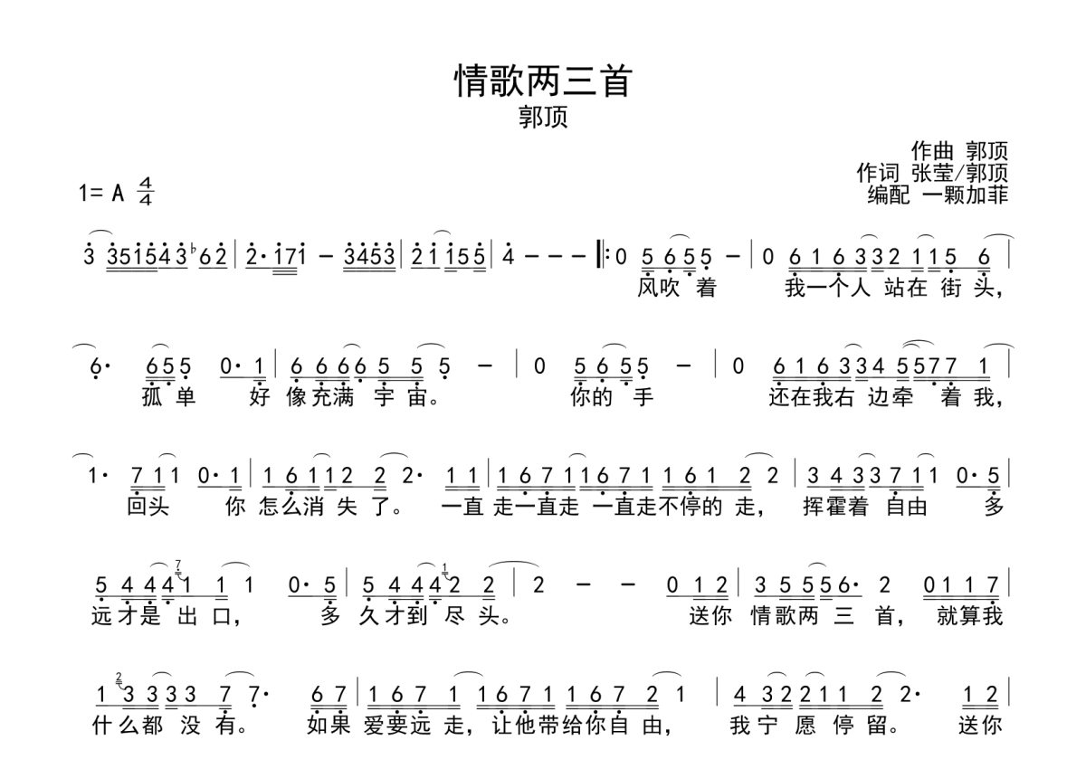 《情歌两三首》是郭顶演唱的一首歌曲,这份简谱共有一张高清图谱,图谱由 @一颗加菲 编配上传。