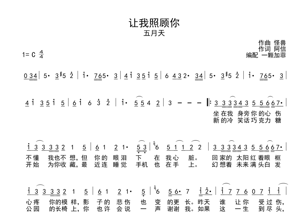《让我照顾你》是五月天演唱的一首歌曲,这份简谱共有两张高清图谱,图谱由 @一颗加菲 编配上传。