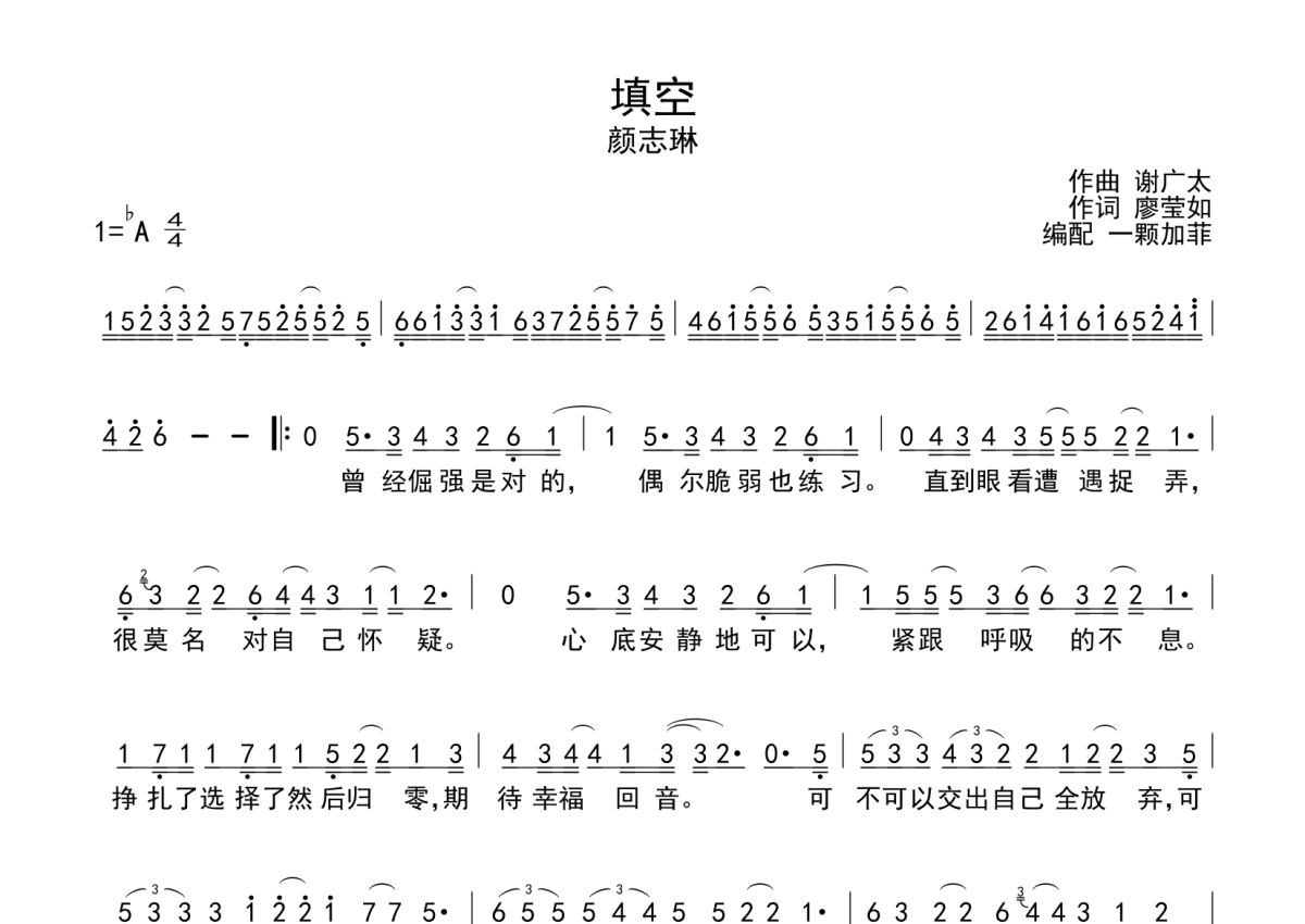 《填空》是颜志琳演唱的一首歌曲,这份简谱共有一张高清图谱,图谱由 @一颗加菲 编配上传。