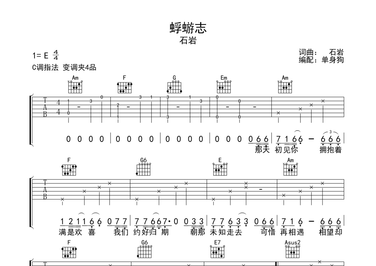 《蜉蝣志》是石岩演唱的一首歌曲,拍号为4/4拍,歌曲原调为E调,但由于原调指法比较难,为了方便弹奏,本吉他谱采用的是C调指法编配,变调夹4品弹奏即为原调,当然也可以根据自己的音域改变变调夹位置,或者通过改变和弦调性,以方便自己弹奏,这份吉他谱共有三张高清图谱,图谱由 @单身狗 编配上传,图谱使用六线谱编配,包含吉他和弦指法、简谱以及歌词部分,使用这份蜉蝣志吉他谱,可以让你更加方便地掌握这首歌曲的弹唱技巧,快来尝试吧。