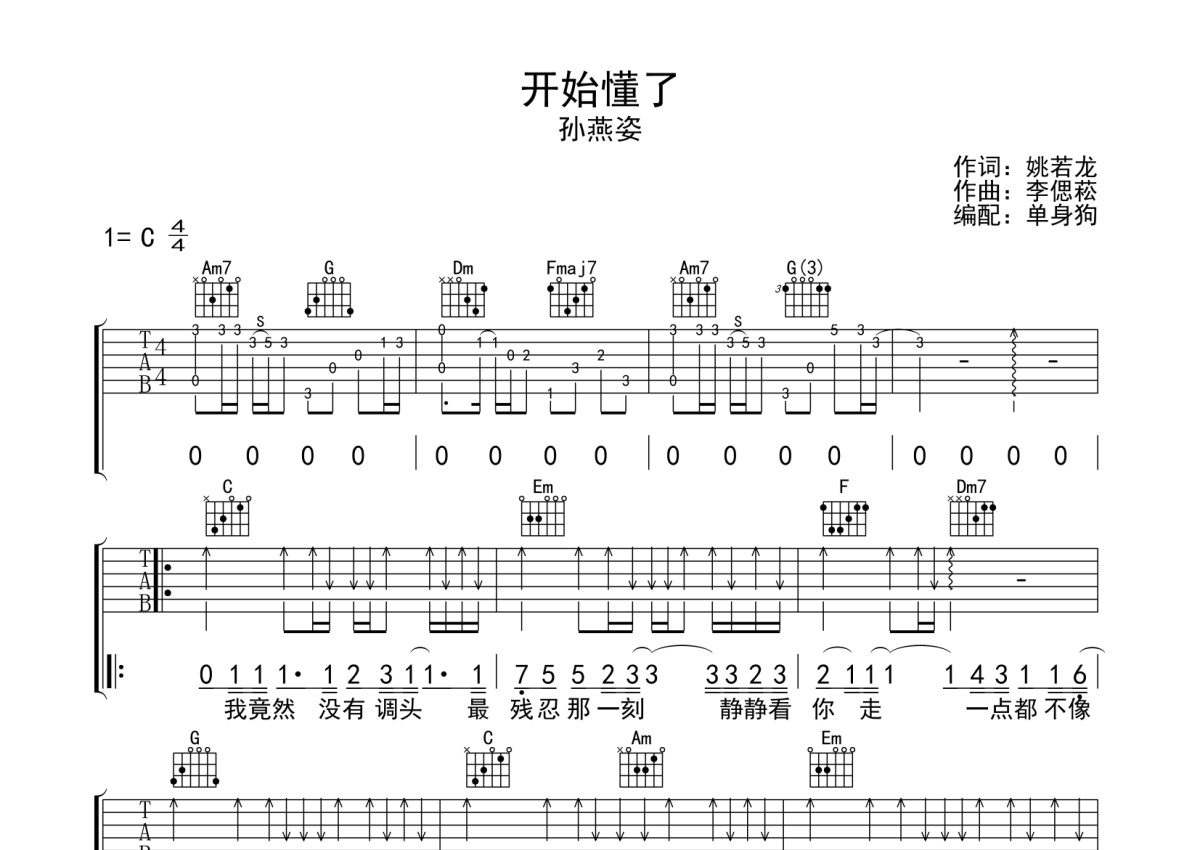 孙燕姿《开始懂了》吉他谱 - C调弹唱六线谱