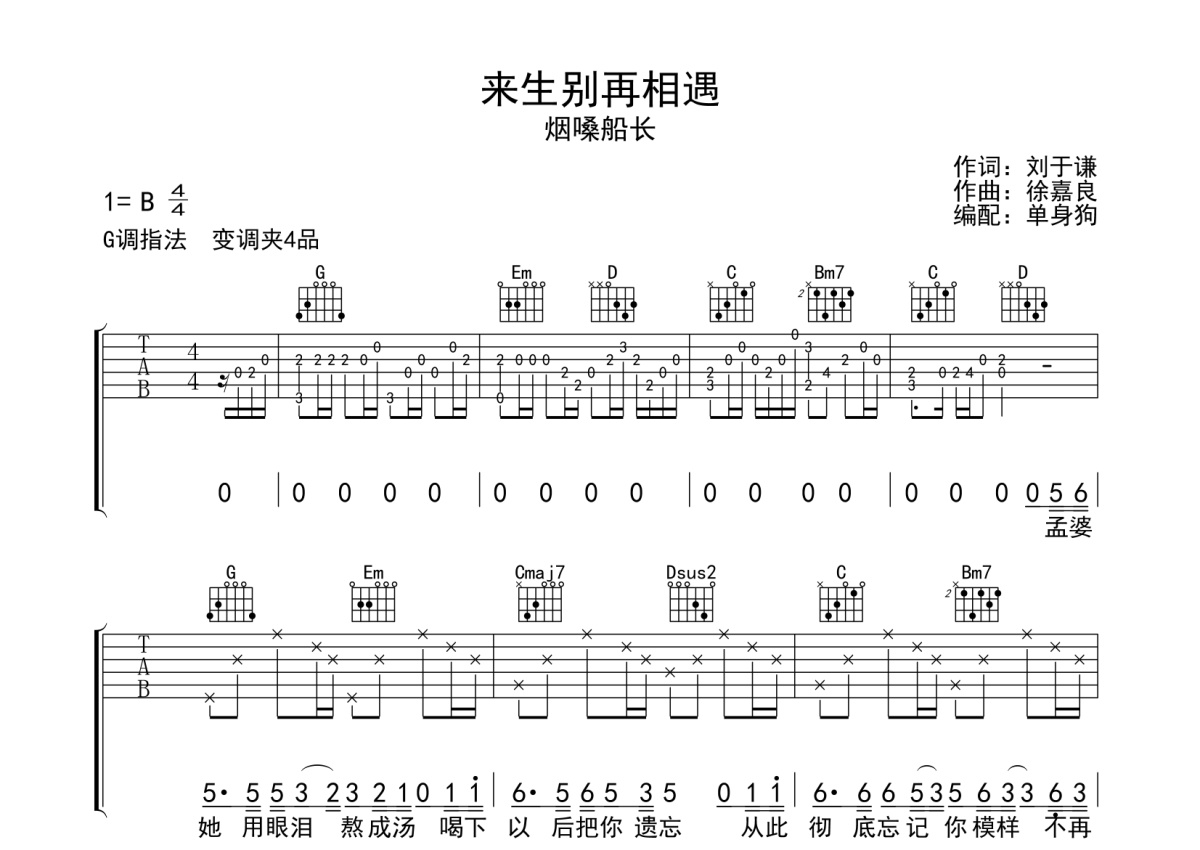 来生别再相遇吉他谱 - 烟嗓船长演唱 - G调弹唱六线谱
