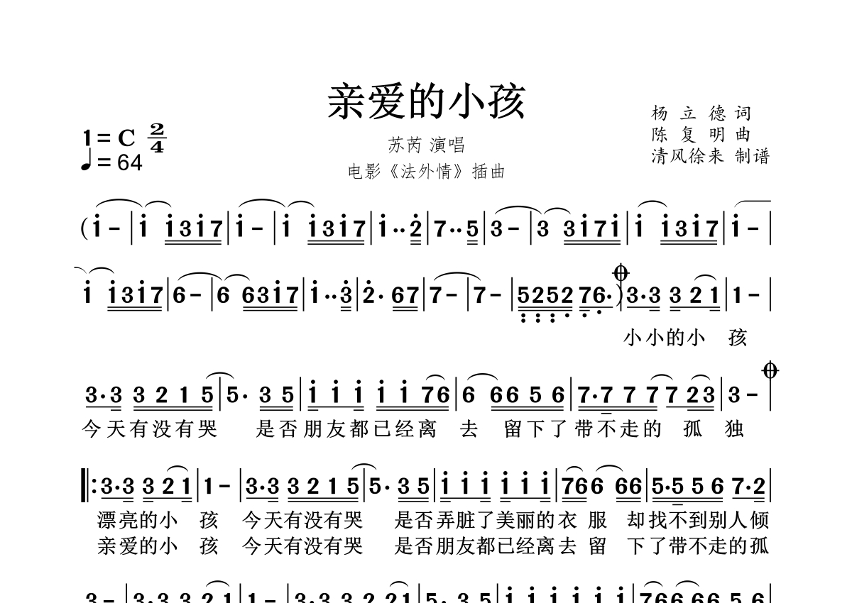 《亲爱的小孩》是苏芮演唱的一首歌曲,拍号为4/4拍,这份简谱共有一张高清图谱,图谱由 @秋天的童话 编配上传。