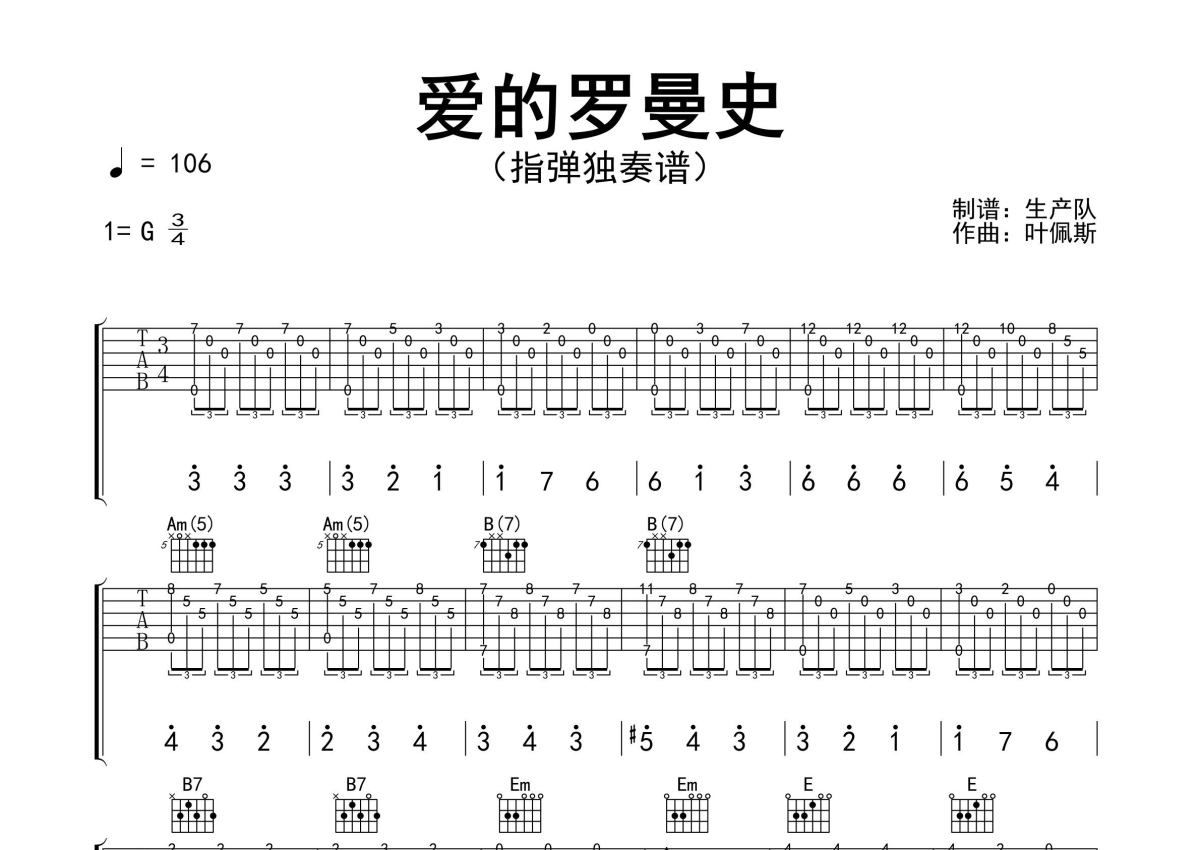 《爱的罗曼史》是叶佩斯演唱的一首歌曲,指弹独奏谱,拍号为3/4拍,歌曲速度为每分钟98拍,歌曲原调为G调,本吉他谱采用的是G调指法编配,演奏时不需要使用变调夹即为原调,这份吉他谱共有两张高清图谱,图谱由 @生产队 编配上传,图谱使用六线谱编配,使用这份爱的罗曼史吉他谱,可以让你更加方便地掌握这首歌曲的演奏技巧,快来尝试吧。吉他经典乐曲《爱的罗曼史》指弹独奏谱,含e小调、E大调独奏和变奏指法编配,值得推荐!。