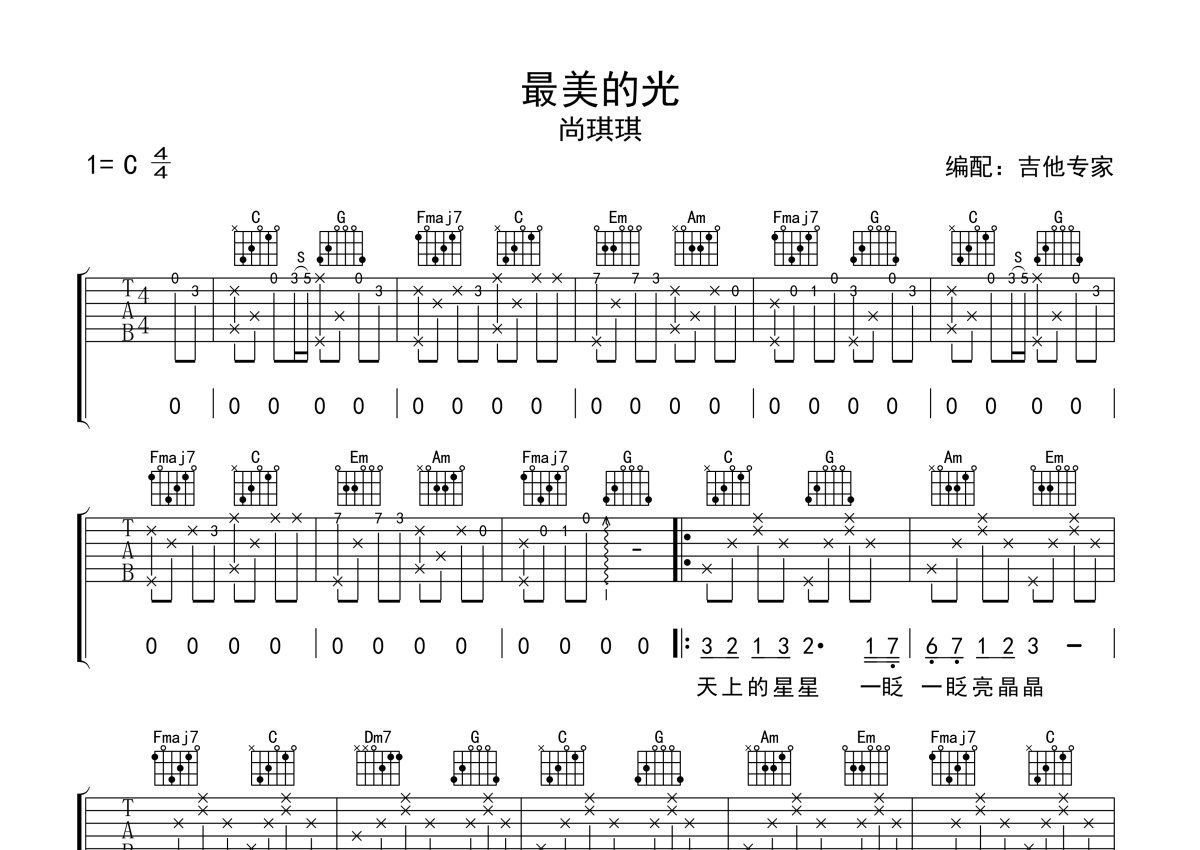 尚琪琪《最美的光》吉他谱 - C调弹唱六线谱