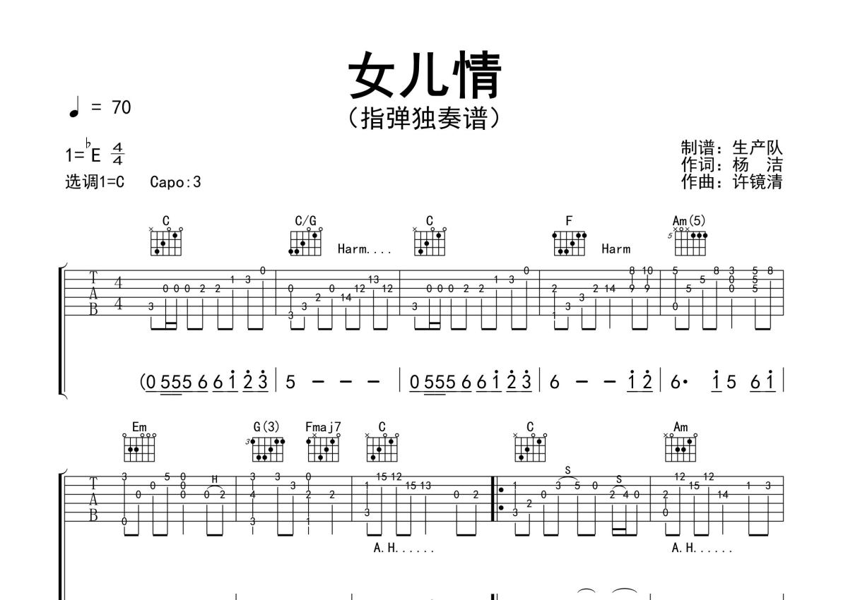 《女儿情》是吴静演唱的一首歌曲,指弹独奏谱,拍号为4/4拍,歌曲速度为每分钟70拍,歌曲原调为Eb调,但由于原调指法比较难,为了方便弹奏,本吉他谱采用的是C调指法编配,变调夹3品弹奏即为原调,当然也可以根据自己的音域改变变调夹位置,或者通过改变和弦调性,以方便自己弹奏,这份吉他谱共有三张高清图谱,图谱由 @生产队 编配上传,图谱使用六线谱编配,使用这份女儿情吉他谱,可以让你更加方便地掌握这首歌曲的演奏技巧,快来尝试吧。吴静演唱的经典歌曲《女儿情》指弹独奏谱,采用轮指和泛音技巧编配,该曲也是电视剧《西游记》插曲,致敬经典,值得推荐!。
