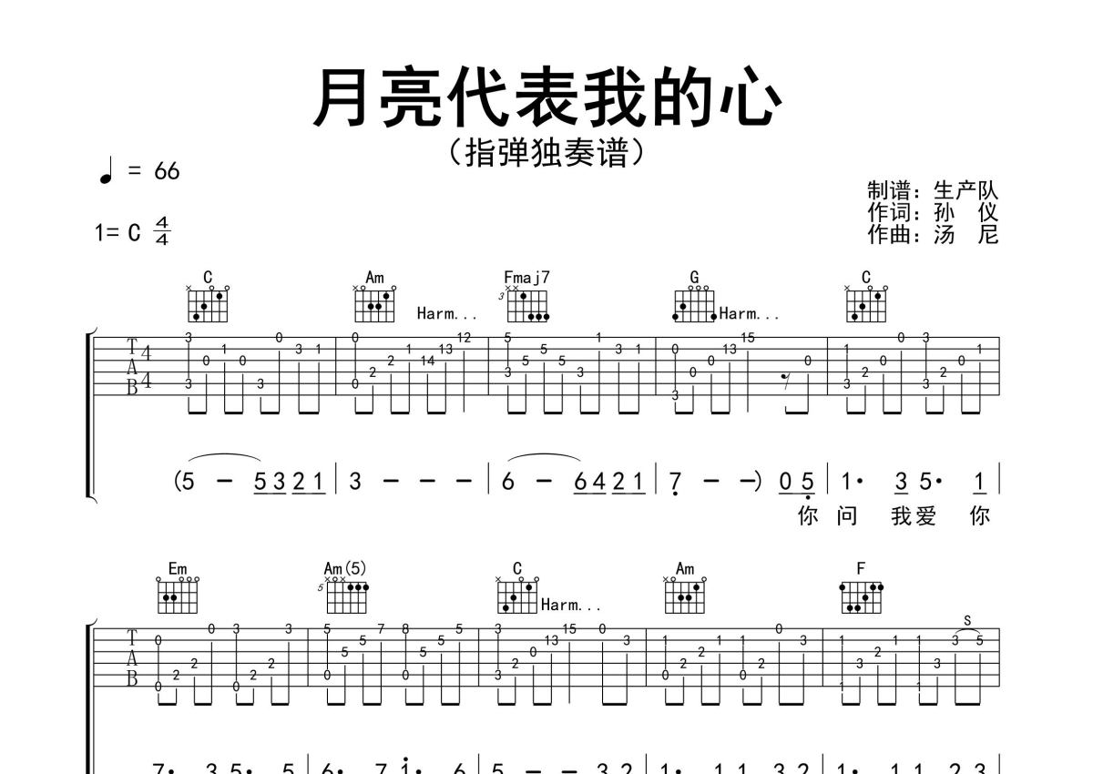 《月亮代表我的心》是邓丽君演唱的一首歌曲,指弹独奏谱,拍号为4/4拍,歌曲速度为每分钟66拍,歌曲原调为C调,本吉他谱采用的是C调指法编配,演奏时不需要使用变调夹即为原调,这份吉他谱共有两张高清图谱,图谱由 @生产队 编配上传,图谱使用六线谱编配,使用这份月亮代表我的心吉他谱,可以让你更加方便地掌握这首歌曲的演奏技巧,快来尝试吧。邓丽君演唱的经典歌曲《月亮代表我的心》指弹独奏谱,吉他必弹曲目,采用泛音技巧编配,致敬经典,值得推荐!。