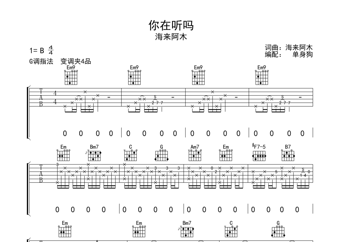 《你在听吗》是海来阿木演唱的一首歌曲,拍号为4/4拍,歌曲原调为B调,但由于原调指法比较难,为了方便弹奏,本吉他谱采用的是G调指法编配,变调夹4品弹奏即为原调,当然也可以根据自己的音域改变变调夹位置,或者通过改变和弦调性,以方便自己弹奏,这份吉他谱共有三张高清图谱,图谱由 @单身狗 编配上传,图谱使用六线谱编配,包含吉他和弦指法、简谱以及歌词部分,使用这份你在听吗吉他谱,可以让你更加方便地掌握这首歌曲的弹唱技巧,快来尝试吧。