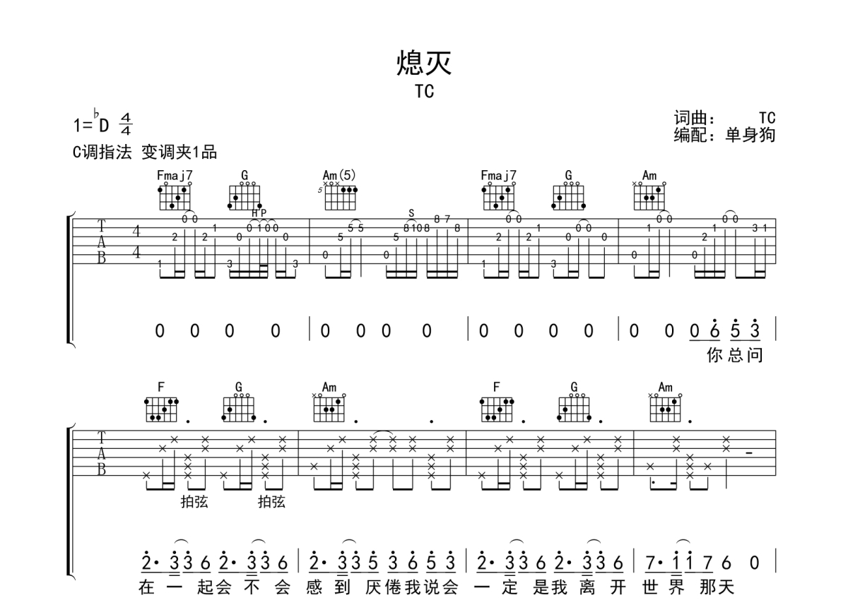 《熄灭》是TC演唱的一首歌曲,拍号为4/4拍,歌曲原调为Db调,但由于原调指法比较难,为了方便弹奏,本吉他谱采用的是C调指法编配,变调夹1品弹奏即为原调,当然也可以根据自己的音域改变变调夹位置,或者通过改变和弦调性,以方便自己弹奏,这份吉他谱共有三张高清图谱,图谱由 @单身狗 编配上传,图谱使用六线谱编配,包含吉他和弦指法、简谱以及歌词部分,使用这份熄灭吉他谱,可以让你更加方便地掌握这首歌曲的弹唱技巧,快来尝试吧。