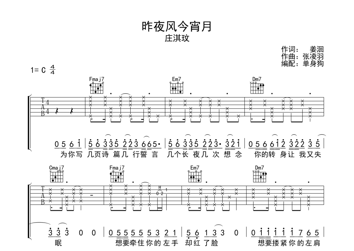 庄淇玟《昨夜风今宵月》吉他谱 - C调弹唱六线谱