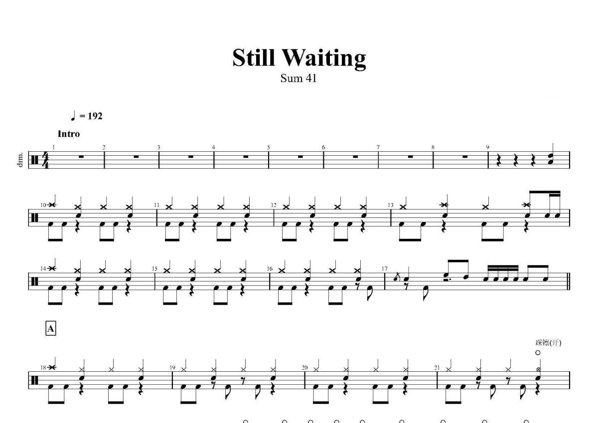 《Still Waiting》是Sum41演唱的一首歌曲,拍号为4/4拍,歌曲速度为每分钟192拍,这份架子鼓谱共有三张高清图谱,图谱由 @音符喷血者 编配上传,图谱使用五线谱编配,使用这份Still Waiting架子鼓谱,你将能够轻松地敲打出这首Sum41的Still Waiting,快来尝试吧。