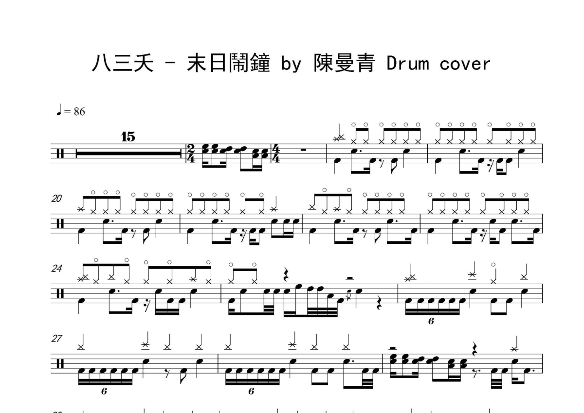 《末日闹钟》是八三夭演唱的一首歌曲,拍号为4/4拍,歌曲速度为每分钟86拍,这份架子鼓谱共有两张高清图谱,图谱由 @音符喷血者 编配上传,图谱使用五线谱编配,使用这份末日闹钟架子鼓谱,你将能够轻松地敲打出这首八三夭的末日闹钟,快来尝试吧。