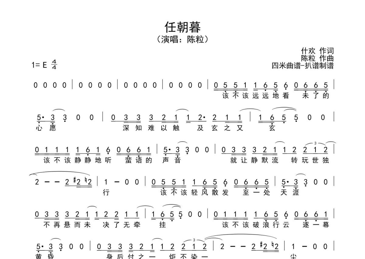 《任朝暮》是陈粒演唱的一首歌曲,拍号为4/4拍,这份简谱共有一张高清图谱,图谱由 @SRV7758521 编配上传。