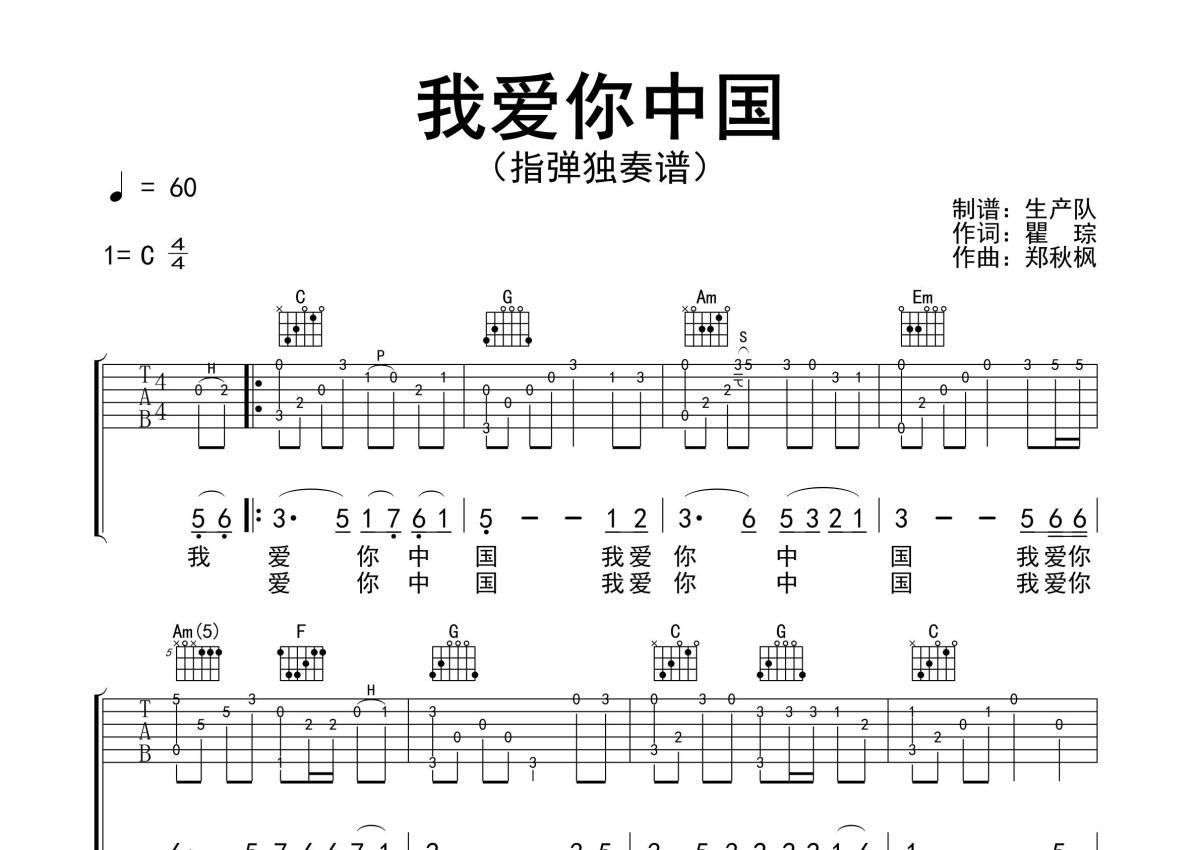 《我爱你中国》是吕思清演唱的一首歌曲,指弹独奏谱,拍号为4/4拍,歌曲速度为每分钟60拍,歌曲原调为C调,本吉他谱采用的是C调指法编配,演奏时不需要使用变调夹即为原调,这份吉他谱共有两张高清图谱,图谱由 @生产队 编配上传,图谱使用六线谱编配,使用这份我爱你中国吉他谱,可以让你更加方便地掌握这首歌曲的演奏技巧,快来尝试吧。吕思清演奏的经典歌曲《我爱你中国》指弹独奏谱,致敬经典,国庆献礼,值得推荐!。